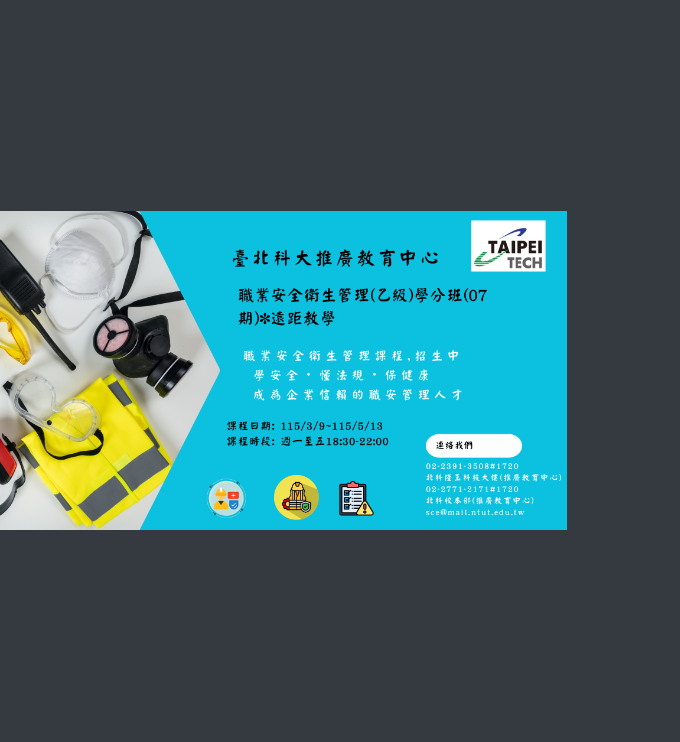 轉知國立臺北科技大學進修部推廣教育中心於3月9日開辦「職業安全衛 生管理(甲乙級)學分班」(遠距教學)相關訊息